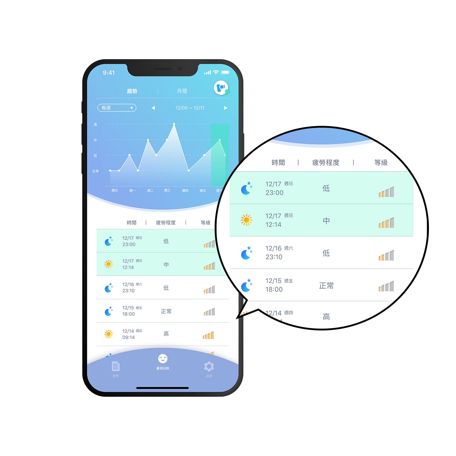 疲勞等級測量功能使用產品兩端的電極測量生物電訊號,憑藉麗臺獨有的演算法,